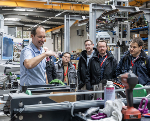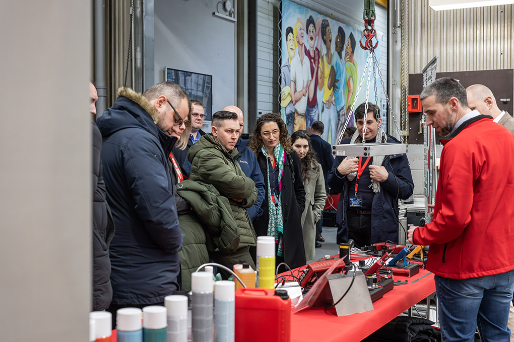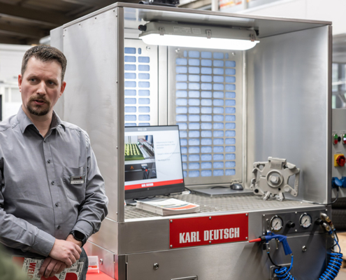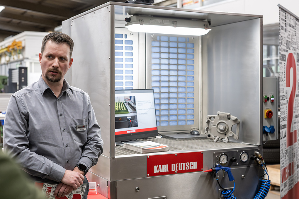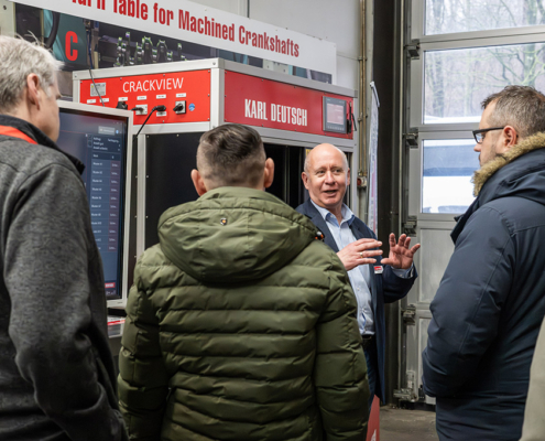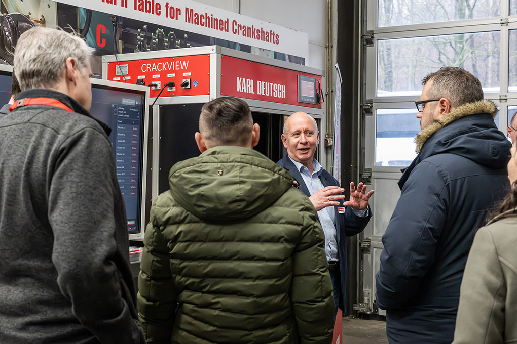 Mittags besuchten uns die knapp 100 Teilnehmerinnen und Teilnehmer für eine Werksbesichtigung. Das KARL DEUTSCH-Team präsentierte aktuell in der Produktion befindliche UT-, MT- und PT-Anlagen sowie unsere Prüfköpfe, Handgeräte und chemischen Prüfmittel. Im Fokus stand natürlich auch die Vorführung von CRACKVIEW – unserer eigenen KI zur Unterstützung bei Prüfaufgaben.